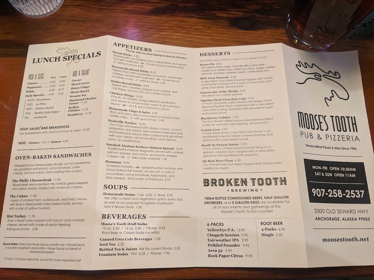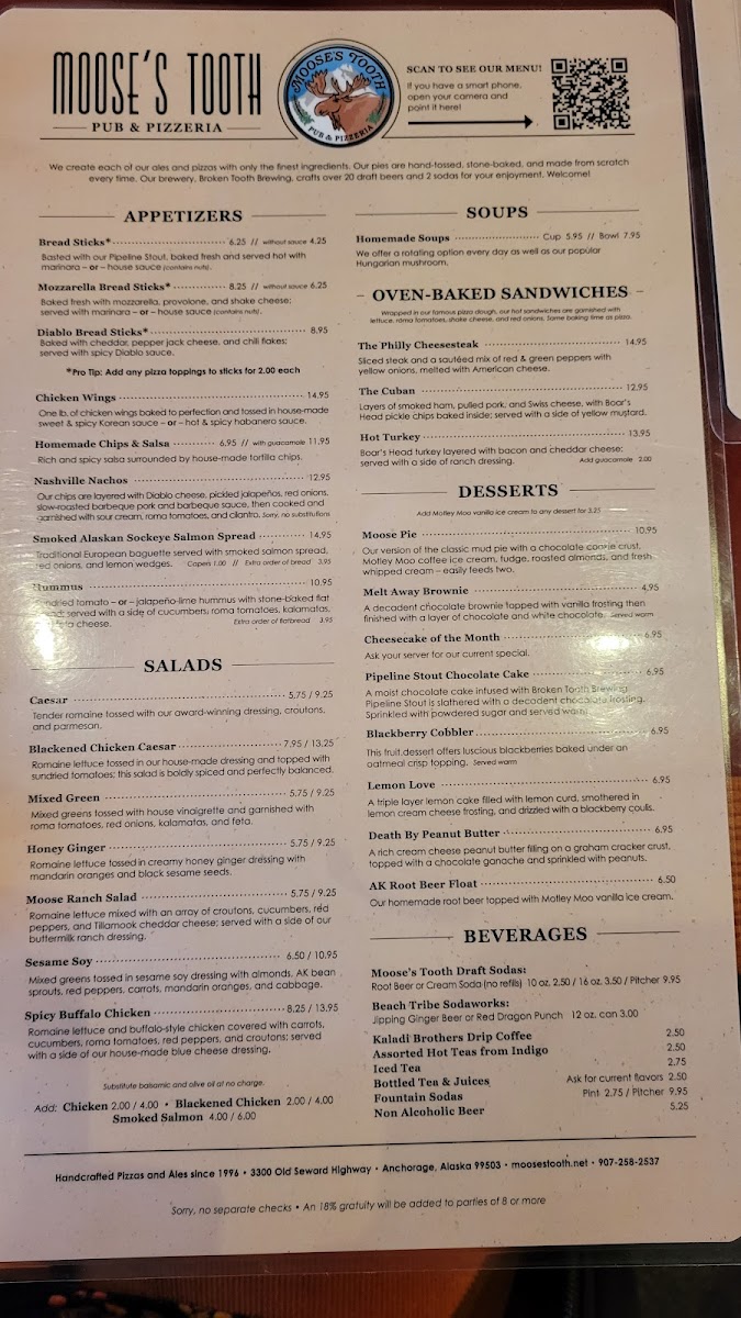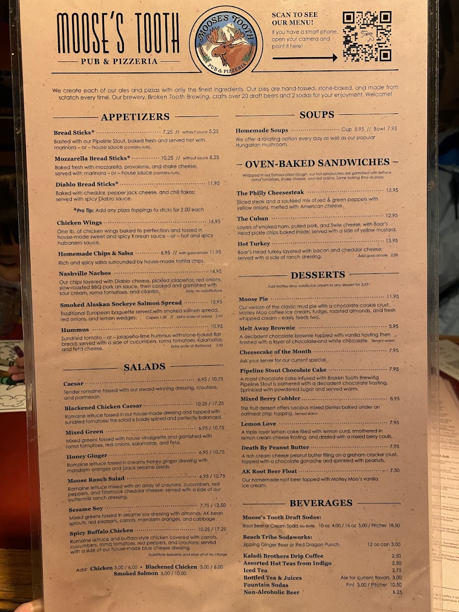 We went to Moose’s Tooth late on a Saturday night and it was PACKED!! After a short wait, we were seated and we totally understood why it was so busy! We ordered 2 medium pizzas between 2 of us (we hadn’t eaten all day and were out hiking, don’t judge..) and the diablo sticks. It was all so good! There’s so many unique pizza options and fun toppings, it’s really hard to choose just one pizza - we ended up with the Call of the Wild and the Mac’n’Cheese pizza and they were both very flavorful and packed with toppings!! We ended up very full (with leftovers) and didn’t have space for dessert, but the desserts looked insanely good too. Super fun atmosphere inside and out - Moose’s Tooth is clearly very popular, and totally worth the wait!