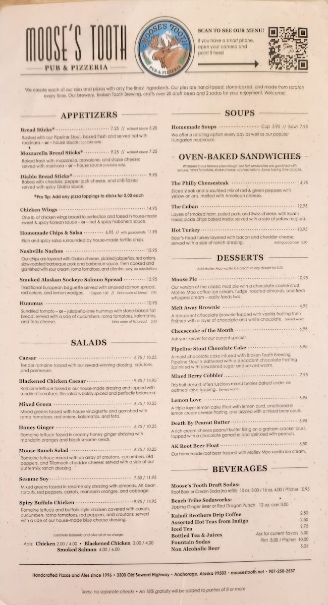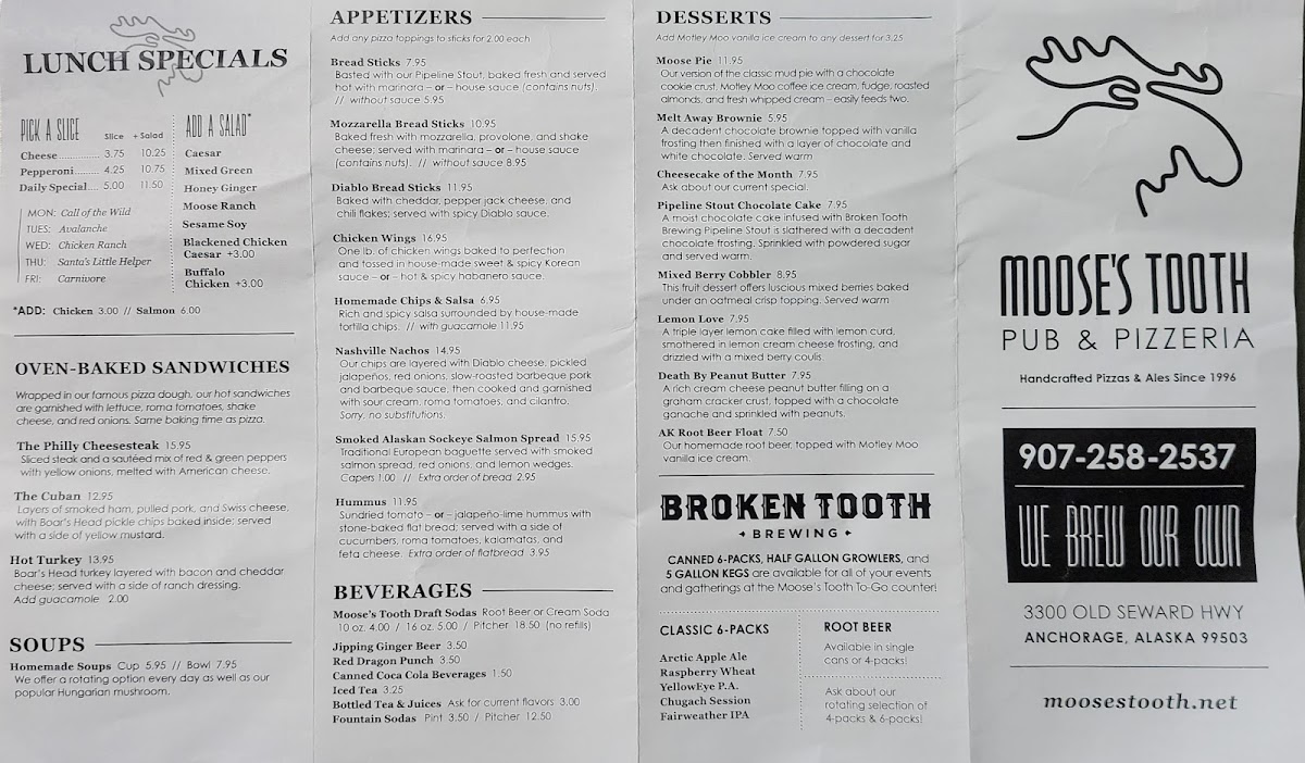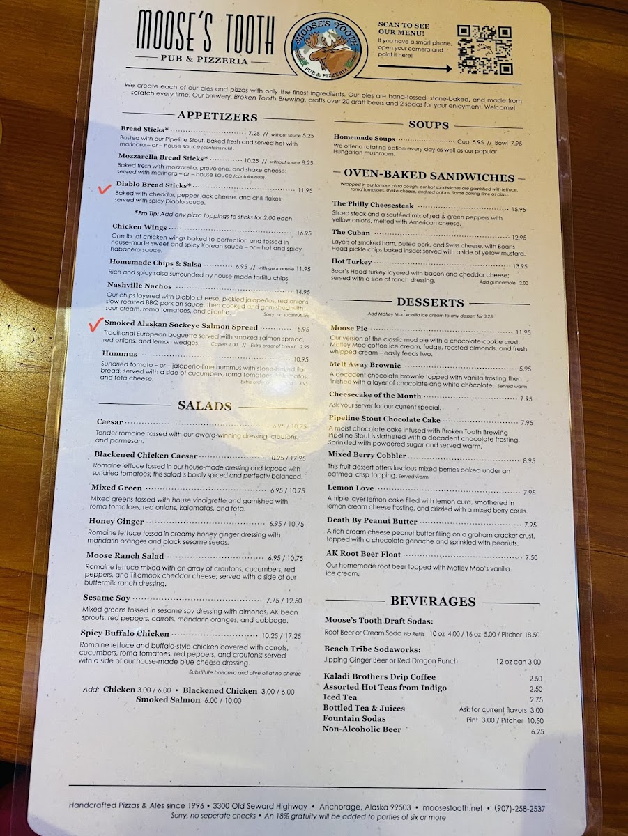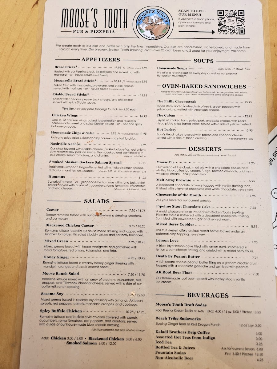 We went to Moose’s Tooth late on a Saturday night and it was PACKED!! After a short wait, we were seated and we totally understood why it was so busy! We ordered 2 medium pizzas between 2 of us (we hadn’t eaten all day and were out hiking, don’t judge..) and the diablo sticks. It was all so good! There’s so many unique pizza options and fun toppings, it’s really hard to choose just one pizza - we ended up with the Call of the Wild and the Mac’n’Cheese pizza and they were both very flavorful and packed with toppings!! We ended up very full (with leftovers) and didn’t have space for dessert, but the desserts looked insanely good too. Super fun atmosphere inside and out - Moose’s Tooth is clearly very popular, and totally worth the wait!