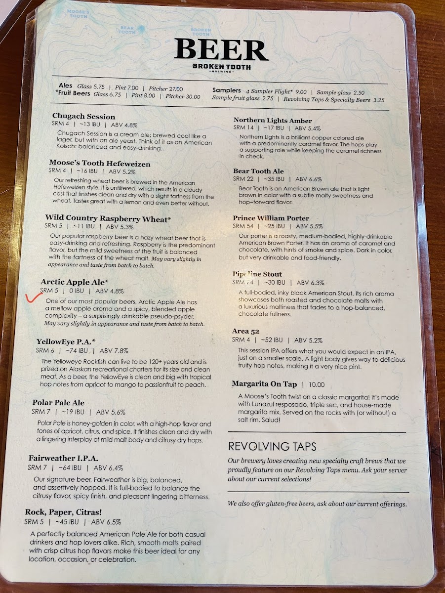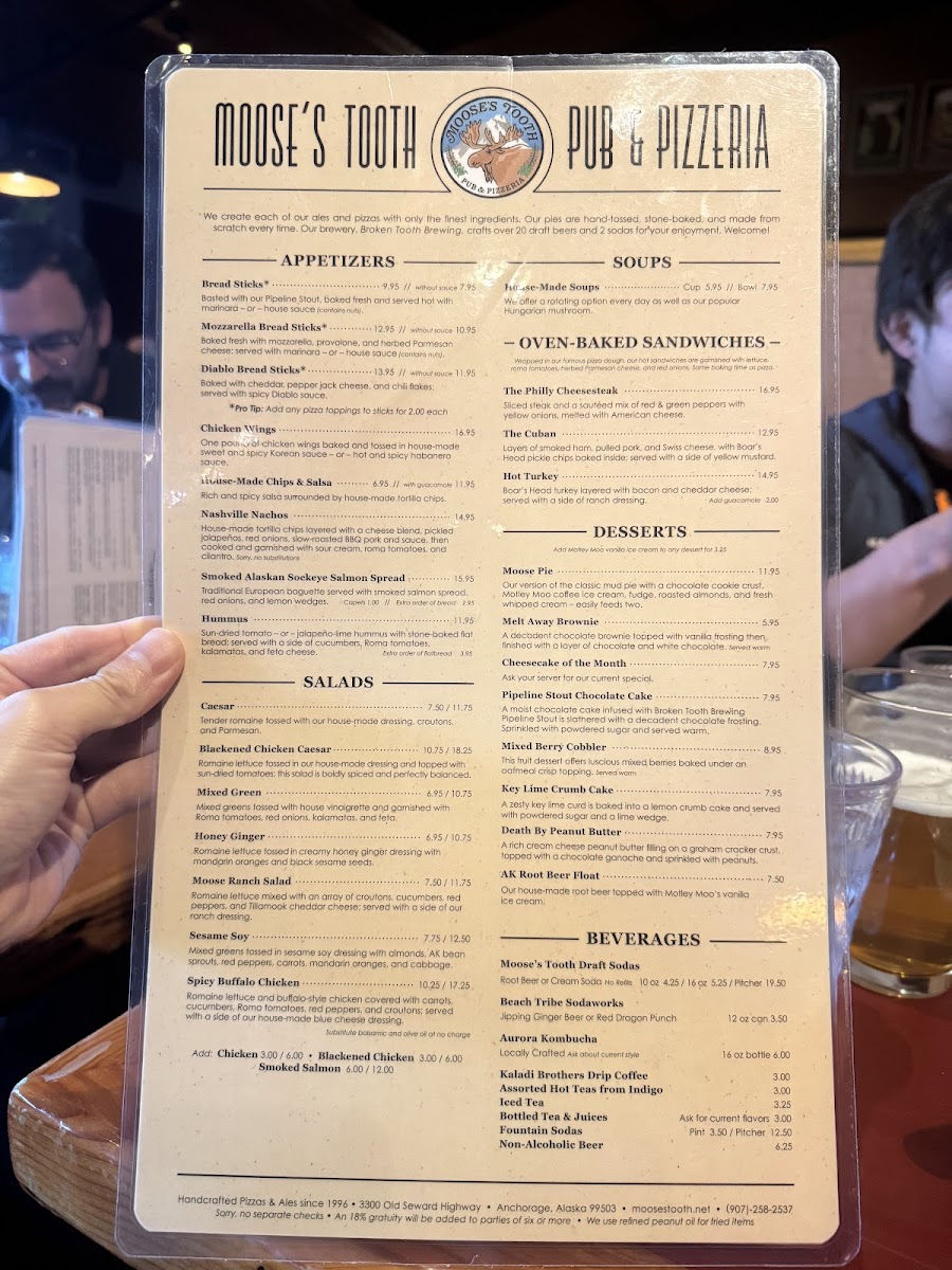 Moose’s Tooth is the stop for pizza when in Anchorage, Alaska! I promise you won’t be disappointed. Super friendly staff! Clean restaurant! I ordered my own creation and Hubbs got the Classic pizza and some house brew. It did not miss!!!!